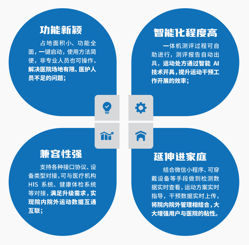 慢病运动健康管理一体机将检测和干预设备整合在温馨舒适的环境下,通过软件系统协调工作,使受检者可以轻松愉悦地开展测试。通过互联网、大数据、5G、人工智能等技术为高血压、糖尿病等慢病人群开具个性化运动处方并进行日常运动干预管理。