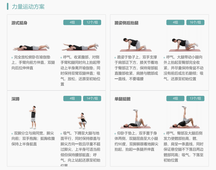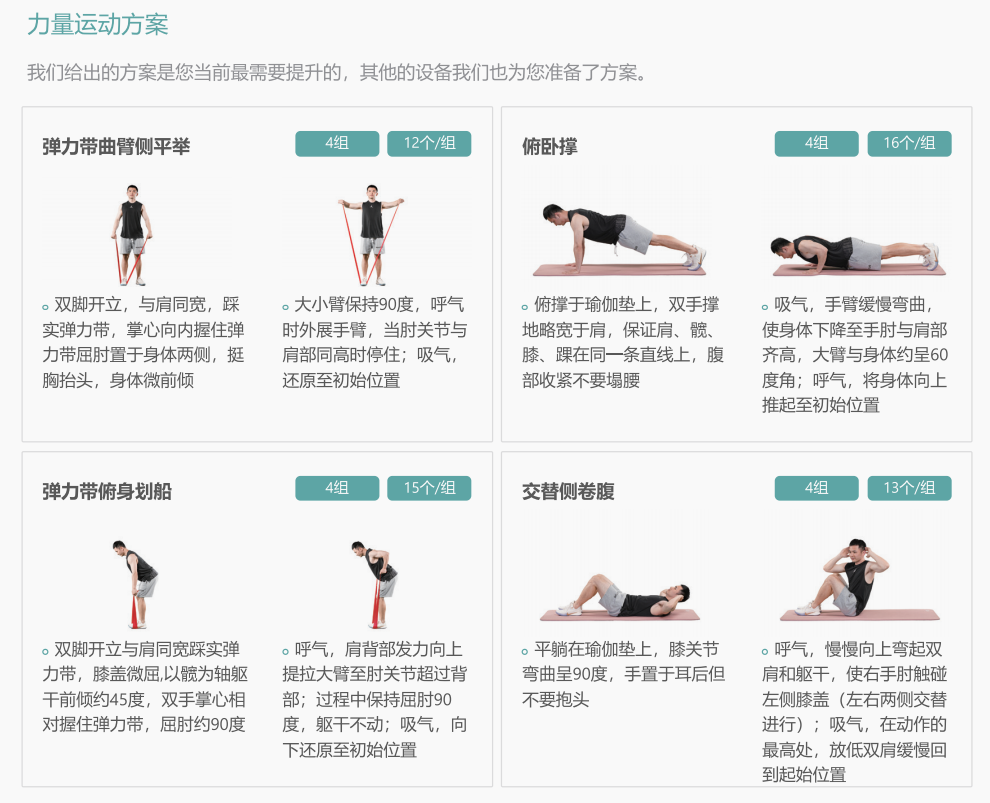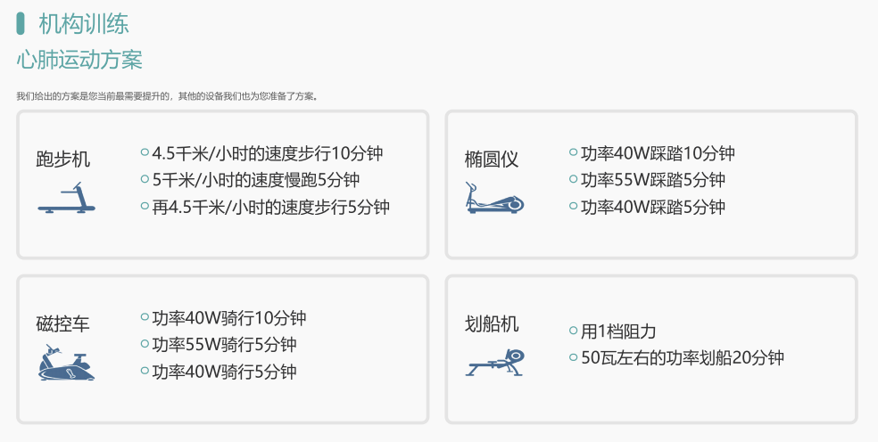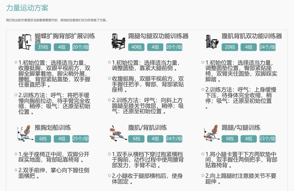 功能模块包括运动能力评估/体适能测评(人体成分、心肺功能、肌肉力量等);智能运动处方(室内运动处方、室外运动处方);智能运动干预(有氧训练、力量训练)和健康管理平台。